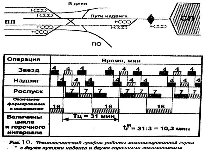 Добавление локомотивов на горку сначала снижает горочный интервал, затем это снижение прекращается. Для расчёта горочного интервала при двух и более локомотивах строится технологический график работы горки. По нему определяется время цикла в работе горки от начала (или конца) одной операции по осаживанию и окончанию формирования со стороны горки до начала (или конца) следующей такой же операции. Горочный интервал определяется делением времени цикла на число составов, распущенных с горки за это время. На рис. 10 представлен график работы горки при двух локомотивах, а на рис.11 при трёх.