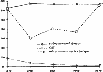 Вместе с моим бывшим аспирантом Кеном Поделом я попытался восполнить этот пробел с помощью простого эксперимента, используя оригинальную процедуру, называемую Тест Когнитивной Склонности (Cognitive Bias Task — CBT)12.Испытуемый видел геометрическую фигуру (цель), а затем появлялись две другие геометрические фигуры (выборы), и испытуемого просили «посмотреть на цель и выбрать ту фигуру из двух, которая вам больше нравится». (Образец CBT показан на рисунке 6.3.) Мы ясно давали испытуемому понять, что нет правильных или неправильных ответов, и что выбор абсолютно произволен. Эксперимент состоял из большого числа таких ситуаций выбора, никакие два из которых не были полностью идентичными. Итак, испытуемым предлагалось делать то, что им нравится. В действительности же фигуры были подобраны таким образом, что испытуемые имели две возможности: основываться либо на свойствах фигуры-цели (которые менялись от одного испытания к другому), либо на некотором устойчивом предпочтении, не относящемся к цели (например, любимый цвет или форма). Несмотря на расплывчатую природу нашего эксперимента, ответы испытуемых могли быть четко квантифицированы и были в высокой степени повторяемыми. Наша «когнитивная проективная» парадигма оказалась весьма информативной, и мы будем возвращаться к ней в различных частях этой книги. Мы провели наши эксперименты со здоровыми испытуемыми и с пациентами, страдавшими различными типами повреждений мозга. Повреждение лобных долей драматически изменяло природу ответов. Повреждение других частей мозга имело незначительный эффект или вовсе не имело никакого. Мы повторили эксперимент, но теперь лишили задачу неопределенности двумя различными способами. Вместо того, чтобы инструктировать испытуемого «выбрать фигуру, которая вам больше нравится», мы просили «выбрать больше похожую на цель», а потом «выбрать наиболее отличающуюся от цели». В условиях, лишенных неопределенности, эффекты повреждений лобных долей исчезали и испытуемые с повреждениями мозга могли выполнять задачу столь же хорошо, как здоровые испытуемые из контрольной группы (см. рис. 6.4).
