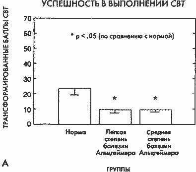 Наш эксперимент показывает, что лобные доли играют решающую роль в ситуациях свободного выбора, когда от субъекта зависит решение, как интерпретировать неопределенную, двусмысленную ситуацию. Как только ситуация лишается неопределенности для субъекта и задача сводится к вычислению единственно возможного правильного ответа, вклад лобных долей уже не является решающим, даже если все другие аспекты задачи остаются теми же самыми. Из всех аспектов человеческой психики нет более интригующих, чем произвольность, интенциональность и свобода воли. Но эти атрибуты человеческой души полностью проявляют себя только в ситуациях, предоставляющих много выборов. Мы, люди, склонны полагать, что умственные способности, которые мы считаем высшими, являются уникально нашими. Философы и ученые многократно заявляли, что воля и интенциональность — специфически человеческие черты. В своей крайней формулировке это утверждение не может быть привлекательным для серьезного нейробиолога. Более вероятно, что эти свойства развивались в ходе эволюции постепенно, возможно по экспоненциальной кривой. Трудно спланировать строгий эксперимент для доказательства этого, но можно высказать аргументы в пользу того, что этот процесс шел параллельно развитию лобных долей. Специалисты по когнитивной нейронауке были не единственными, кто в ущерб себе игнорировал субъективное, адаптивное принятие решений. Намного хуже, что субъективное принятие решений также игнорировалось деятелями образования. Вся наша образовательная система базируется на обучении истинностному принятию решений. И это имеет место не только в США, но и повсюду, по крайней мере, внутри западной культурной традиции. Стратегиям субъективного, адаптивного принятия решений просто не обучают; они приобретаются каждым человеком идиосинкратически, в ходе личного познавательного развития, методом проб и ошибок. Разработка методов обучения принципам субъективного принятия решений находится в числе наиболее актуальных задач, стоящих перед деятелями образования и школьными психологами. Психология развития также сосредоточивается на истинностном принятии решений, поэтому хронология и стадии развития субъективного, адаптивного принятия решений практически неизвестны. Однако мы знаем, что на начальных стадиях деменции адаптивное принятие решений страдает ранее истинностного принятия решений. Мой бывший докторант Алан Клюгер и я провели исследование в Милхаузеровском Центре изучения деменции Нью-Йоркского университета13. Мы сравнили степень нарушения выполнения CBT и его лишенного двусмысленности, истинностного аналога у пациентов на различных стадиях деменции типа болезни Альцгеймера. Выполнение субъективной, основывающейся на предпочтении версии задачи нарушалось в процессе заболевания значительно раньше, чем выполнение истинностной, «соответствия-по-сходству» версии. Это отражено на рисунке 6.5 (А и В).