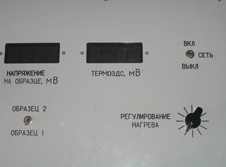 Для измерения температуры используется термопара, один из спаев которой помещен в сосуд Дьюара (термос) с тающим в воде льдом. Другой спай приклеен внутри термоблока. Термоблок помещается в печь – нагреватель с регулируемым нагревом. Для предотвращения случайных замыканий с элементами нагревателя термоблок изолирован с помощью пробирки, в которую для улучшения теплообмена насыпан песок. Нагрев регулируется с помощью ручки в блоке регулятора нагрева (РН). Время установления температуры при каждом положении ручки регулятора составляет 8 Для определения сопротивления образцов на них измеряется напряжение. При этом ток через образцы поддерживается с помощью источника стабильного тока (ИСТ) неизменным. В работе выбран ток Конструктивно установка состоит из корпуса, в котором находятся блок питания, состоящий из источника стабильного тока (ИСТ), источника питания электронных вольтметров (ИПВ) с индикаторами и регулятора нагрева (РН). Блок питания подключается к внешней сети переключателем П1. С помощью разъемов соответствующие цепи подключаются к образцам, термопаре и нагревателю. Передняя панель установки показана на рис. 3.