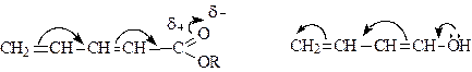 В этой сопряжённой системе у карбонильной группы наблюдается отрицательный мезомерный эффект, так как эта группа сама является частью сопряжённой системы.