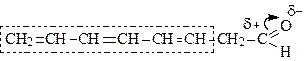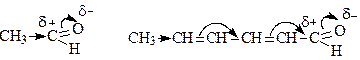 В этой системе есть сопряжённый фрагмент, но карбонильная группа отделена от него метиленовой группой. Она не связана с этим фрагментом в единую сопряжённую систему, и поэтому мезомерный эффект у карбонильной группы отсутствует. Особенность мезомерного влияния - в отличие от индуктивного эффекта, мезомерный эффект не затухает вдоль цепи сопряжённых двойных связей, т.к. сопряжённая система ведет себя как единое целое. В таких системах передача взаимного влияния осуществляется настолько полно, что различие во взаимном влиянии атомов, непосредственно связанных друг с другом и разделённых системой сопряжённых связей, в ряде случаев стирается. Так, например, два aльдегида - ацетальдегид и сорбиновый альдегид
