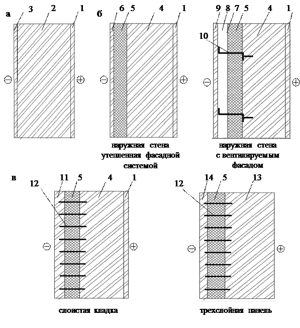 Рис. 2.1 Виды наружных стен энергоэффективных зданий: а - однослойная, б - двухслойные, в - трехслойные; 1 – штукатурка; 2 – ячеистый бетон; 3 – защитный слой; 4 – наружная стена; 5 – утеплитель; 6 – фасадная система; 7 – ветрозащитная мембрана; 8 – вентилируемый воздушный зазор; 9 – декоративная панель; 10 – кронштейн; 11 – облицовочный кирпич; 12 – гибкие связи; 13 – керамзитобетонная панель; 14 – фактурный слой При дальнейшей эксплуатации зданий выявилось много дефектов, связанных с нарушением воздухообмена в помещениях, появлением темных пятен, плесени и грибков на внутренних поверхностях наружных стен. Поэтому в настоящее время внутреннее утепление используется лишь при установке приточно-вытяжной механической вентиляции. В качестве утеплителей применяются материалы с низким водопоглощением, например, пеноплекс и напыляемый пенополиуретан. Системы с наружным утеплением имеют ряд существенных преимуществ. К ним относятся: высокая теплотехническая однородность, ремонтопригодность, возможность реализации архитектурных решений различной формы. В практике строительства находят применение два варианта фасадных систем: с наружным штукатурным слоем; с вентилируемым воздушным зазором. При первом варианте исполнения фасадных систем в качестве утеплителей в основном используются плиты пенополистирола. Утеплитель от внешних атмосферных воздействий защищен базовым клеевым слоем, армированной стеклосеткой и декоративным слоем. В вентилируемых фасадах используется лишь негорючий утеплитель в виде плит из базальтового волокна. Утеплитель защищен от воздействия атмосферной влаги фасадными плитами, которые крепятся к стене с помощью кронштейнов. Между плитами и утеплителем предусматривается воздушный зазор. При проектировании вентилируемых фасадных систем создается наиболее благоприятный тепловлажностный режим наружных стен, так как водяные пары, проходящие через наружную стену, смешиваются с наружным воздухом, поступающим через воздушную прослойку, и выбрасываются на улицу через вытяжные каналы. Трехслойные стены, возводимые ранее, применялись, в основном, в виде колодцевой кладки. Они выполнялись из мелкоштучных изделий, расположенных между наружным и внутренним слоями утеплителя. Коэффициент теплотехнической однородности конструкций относительно невелик (r < 0,5) из-за наличия кирпичных перемычек. При реализации в России второго этапа энергосбережения достичь требуемых значений приведенного сопротивления теплопередаче с помощью колодцевой кладки не представляется возможным. В практике строительства широкое применение нашли трехслойные стены с использованием гибких связей, для изготовления которых применяется стальная арматура, с соответствующими антикоррозионными свойствами стали или защитных покрытий. В качестве внутреннего слоя используется ячеистый бетон, а теплоизоляционных материалов – пенополистирол, минеральные плиты и пеноизол. Облицовочный слой выполняется из керамического кирпича. Трехслойные бетонные стены при крупнопанельном домостроении применяются давно, но с более низким значением приведенного сопротивления теплопередаче. Для повышения теплотехнической однородности панельных конструкций необходимо использовать гибкие стальные связи в виде отдельных стержней или их комбинаций.