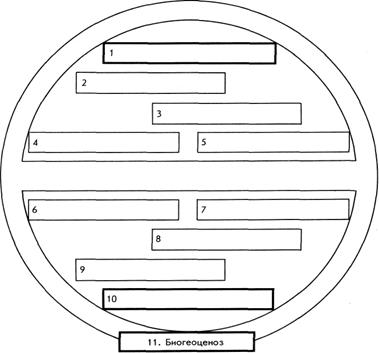 Академик В.Н.Сукачев ұсынған биогеоценоздың «соқыр» моделінің сызбасы. Бастапқы моделін жасақтау үшін бос ұяшықтарға төменде берілген биогеоценоз компоненттерін толтырыңыздар. Ұсынылған түсініктердің бағыныштылығын дәлелдеңіздер: - атмосфера; - өсімдіктер жамылғысы; - топырақ қабаты; - гидрологиялық жағдайлар; - экотоп (қосымша, биогеоценоздың өлі компоненттері); - биоценоз; - тау жыныстары; - жануарлар әлемі (зооценоз); - саңырауқұлақтар (микоценоз); - микроағзалар(микробиоценоз);