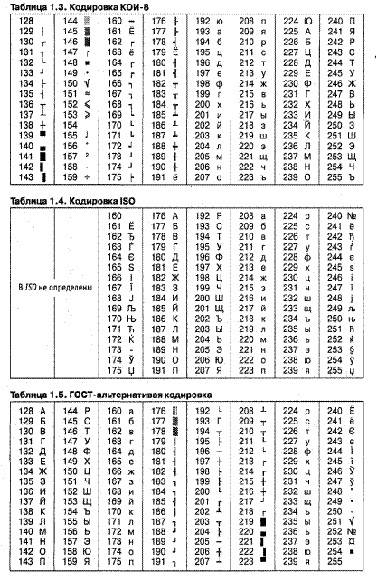 Первые 32 кода (0ё1F) – как правило, управляющие: они служат для представления сигналов, которые имеют специальное назначение: ¨ при выводе информации на печать; ¨ при передаче ее по линиям; ¨ могут использоваться по усмотрению разработчиков систем. Изображение их зависит от знакогенератора дисплея. Расширение таблицы (80ёFF) кода ASCII имеет различное наполнение: 1) стандартный знакогенератор IBM PC, псевдографика, математические символы и др.; 2) знакогенератор с русским шрифтом, используется в отечественных ПЭВМ (ЕС1840, ЕС1841); 3) знакогенератор с русским шрифтом (альтернативный вариант), в котором использовано зарубежное ППО без настройки на новые символы псевдографики. Поставляется обычно драйвер ALFA.exe в ОЗУ (загрузка в начале сеанса), который перехватывает символы 80ёFF при выводе на дисплей и переделывает их в то, что нужно для знакогенератора. В 1994 году в MS DOS 6.22 введена настройка на русские буквы (кодовая таблица кириллицы № 866). В Windows используется другая кодировка символов, отличающаяся от IBM-й.* Этот 8-битовый код называется ANSI-кодировкой. Имеется и русская версия ANSI-таблиц. Предыдущую кодировку IBM для DOS-программ стали называть ОЕМ-кодировкой. Windows содержит стандартные функции для перекодировки из ОЕМ в ANSI и обратно. В настоящее время все большее распространение приобретает двухбайтовая кодировка Unicode, в которой может быть до 65 535 символов. В этой кодировке (ее поддерживает, например, OC Windows NT, Windows ХР и др.) имеются номера для практически всех применяемых символов (букв алфавитов разных языков, математических, декоративных символов и т.д.).