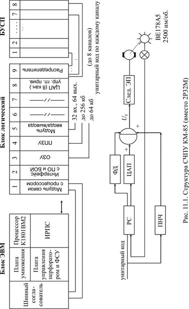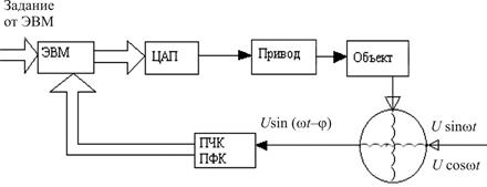 Первоначально микропроцессорные СЧПУ, проведя интерполяцию программным путем, выдавали задание в двоичном коде на фазовую систему связи с электроприводом (см. рис. 10.7, 10.8). В дальнейшем от фазовых устройств связи с электроприводом отказались, возложив такие операции, как сравнение задания и сигнала обратной связи, реализацию пропорционального регулятора положения, скоростную компенсацию задающего сигнала (частичная инвариантность по управлению), на ЭВМ. Структура одного канала связи с приводом представлена на рис. 10.9. В обратной связи по положению с фазовращателем обычно используют как ПЧК при высоких скоростях, так и ПФК при малой скорости.