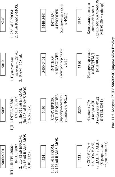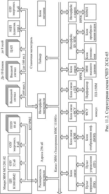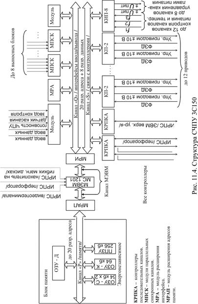 На рис. 11.2 приведена структурная схема СЧПУ 2С42-65. Структура, в принципе, не отличается от предыдущей, однако контуры положения уже реализованы программным способом. Имеется блок умножения для операций с плавающей запятой, ВЗУ КНМЛ. Однако управлять более чем тремя осями одновременно данная структура не может – не хватает ресурсов. На рис. 11.3 приведена структурная схема СЧПУ «Нейрон Н3.611». Данная СЧПУ является аналогом СЧПУ «Вектор» фирмы Olivetti. Это единственная отечественная МПС до 90-х годов для управления позиционными и контурными системами, выполненная на элементах Intel-й ветви МП. В системе основной вычислитель выполнен на МП К580ВМ1А и арифметическом процессоре АП. Дополнительный ведомый процессор ДП является интеллектуальным контроллером, обеспечивает обмен с приводами и электроавтоматикой и первоначальную обработку информации в том числе для выполнения роли регуляторов положения в фазово-импульсных контурах. СЧПУ управляет двумя приводами подач На рис. 11.4 приведена структурная схема СЧПУ 3С-150 (третье поколение СЧПУ). Данная стойка имеет модульную конструкцию и большие возможности за счет: ¨ большого объема памяти энергонезависимого динамического ОЗУ, защищенного по коду Хемминга, и ППЗУ, управляемых диспетчером памяти МРАП; ¨ большого набора интеллектуальных контроллеров, выполненных с применением МП К580ВМ80А; ¨ модуля расширенной арифметики МРА как сопроцессора для операций с плавающей запятой. Однако данная СЧПУ и другие из этой серии (3С-120, 3С-180), созданные в конце 80-х годов, не успели стать отлаженными до начала разрушительных процессов в России. СЧПУ получилась габаритной, с большим числом плат и недостаточно надежной.