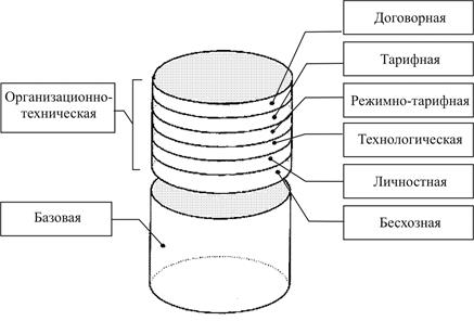 Рис. 13.7. Составляющие энергопотребления предприятия Поэтому необходимо обратить внимание на возможности минимизации ОTC уровня энергопотребления предприятия, которая OTC уровня энергопотребления предприятия состоит по крайней мере из шести основных частей: 1) договорная, фиктивная составляющая связана с расчетами за энергоресурсы с поставщиками не по фактическим значениям энергопотребления, а по договорным, как правило, существенно завышенным значениям, что приводит потребителя к финансовым потерям. Эта составляющая потерь сводится к минимуму (и даже к нулю) при организации АСКУЭ коммерческого учета; 2) тарифная составляющая, связанная с расчетами за энергоресурсы с поставщиком по фактическим значениям энергопотребления, но не по самому выгодному для потребителя тарифу из-за отсутствия учета, способного реализовать этот лучший тариф. Эта составляющая потерь сводится к нулю при организации АСКУЭ коммерческого учета, способной отслеживать любые действующие и перспективные тарифы; 3) режимно-тарифная составляющая, связанная с возможностью изменения режимов работы оборудования по времени и величине энергопотребления в заданных зонах суток (пиковых зонах) с целью минимизации тарифных платежей в рамках одного и того же тарифа. Эта составляющая потерь сводится к минимуму при организации АСКУЭ коммерческого и технического учета с элементами прогнозирования и анализа состава нагрузок; 4) технологическая составляющая, связанная с нарушением технологического цикла и неэффективным использованием оборудования. Эта составляющая потерь сводится к минимуму при организации АСКУЭ глубокого (до уровня цехов, участков и крупных энергоустановок) технического учета с введением хозрасчета по энергоресурсам между подразделениями предприятия или норм потребления энергоресурсов подразделениями предприятия; 5) личностная составляющая, связанная с использованием персоналом производственного оборудования в личных целях. Эта составляющая потерь сводится к минимуму при организации АСКУЭ глубокого технического учета с расчетом реальных удельных норм на выпуск единицы продукции. Сюда же можно отнести управленческий эффект – это возможность отслеживания событий, происходящих на подконтрольных объектах, уменьшение времени принятия решений и, следовательно, оптимизации процесса обслуживания энергосистемы предприятия; 6) бесхозная составляющая, связанная с незаинтересованностью, безразличием персонала на рабочих местах к энергопотерям разного вида. Эта составляющая сводится к минимуму при организации Достижению организационно-технической эффективности внедрения АСКУЭ может также поспособствовать: 1) повышение надежности режима электроснабжения, так как уменьшается число ошибочных операций, сокращается время отыскания места аварии, уменьшается число аварий, сокращается время простоя оборудования; 2) управление электропотреблением, расходом воды, пара, газа, тепловой энергии по предприятиям, цехам, участкам и т.д., при этом предоставляется возможность учитывать технологические особенности их работы во времени и соответственно корректировать нормы расхода электроэнергии, воды, пара, газа, тепловой энергии. Это позволит устранить переборы лимитов электроэнергии (снять штрафные санкции) и составлять оптимальный граф