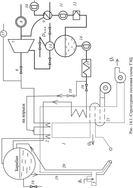 14.1. Описание и классификация котельных Котельные установки необходимы для получения перегретого пара на ТЭЦ и ГРЭС, насыщенного технологического пара на промышленных котельных, получения горячей воды для технологических нужд, отопления, горячего водоснабжения. Все котельные установки предназначены для получения тепловой энергии. На рис. 14.1 представлена структурная тепловая схема ТЭЦ. Питательный насос 14 через регулирующий клапан 16 снабжает питательной водой паровой котел 1. В топку котла с помощью топливоприготовительных устройств 3 подается топливо В т (каменноугольная пыль, горючий газ, мазут или смесь разных видов топлива). Вентилятором 4 нагнетается воздух Q в и дымососом 5 отсасываются продукты сгорания – дымовые газы Qr. Требуемая подача топливоприготовительных устройств, вентиляторов, дымососов и питательных насосов устанавливается автоматически или дистанционно в зависимости от паропроизводительности G п.п и давления перегретого пара P п.п. Насыщенный водяной пар, выработанный в испарительной части парового котла, перегревается до требуемой температуры в пароперегревателе 2; при этом температура перегрева t п.п поддерживается вблизи заданного значения автоматическим регулятором. Далее перегретый пар через регулирующие клапаны 6 поступает в проточную часть турбины 7, где происходит превращение тепловой энергии теплоносителя – перегретого водяного пара – в механическую энергию вращения ротора турбины и генератора 8. Для обеспечения постоянства частоты генерируемого тока ротор турбины должен вращаться с постоянной скоростью независимо от электрической нагрузки генератора. Поддержание постоянства частоты вращения n осуществляется АСР скорости турбины. Отработанный пар из турбины поступает в конденсатор 9, где он охлаждается и конденсируется на поверхности трубной системы, в которой циркулирует охлаждающая вода, поступающая от насоса 10. Уровень конденсата в конденсаторе Н к должен поддерживаться постоянным независимо от количества конденсируемого в нем пара. Эту задачу выполняет автоматический регулятор уровня в конденсаторе, воздействующий на подачу конденсатных насосов. Далее конденсат турбины прокачивается насосами 11 через систему подогревателей низкого давления (ПНД) 12 и поступает в смешивающий подогреватель – деаэратор 13. В деаэраторе конденсат смешивается с химически очищенной водой D х.о.в, подаваемой для восполнения потерь, и доводится до температуры насыщения (кипения), при которой происходит удаление растворенного в воде кислорода О2. Нормальный режим работы деаэратора и установленного за ним питательного насоса 11 возможен лишь при постоянстве давления пара в деаэраторной головке P д и уровня воды H д в аккумуляторном баке. Это обеспечивается автоматическими регуляторами давления и уровня в деаэраторе, воздействующими соответственно на расход греющего пара и химически очищенной воды, поступающих в деаэратор. Вода из деаэратора перекачивается питательными насосами 14 через систему подогревателей высокого давления 15 и поступает в экономайзер и испарительную часть парового котла. Расход воды регулируется автоматическим регулятором питания. На этом технологический цикл превращения теплоты в электрическую энергию замыкается, и описанный выше процесс повторяется. Тепловые элект