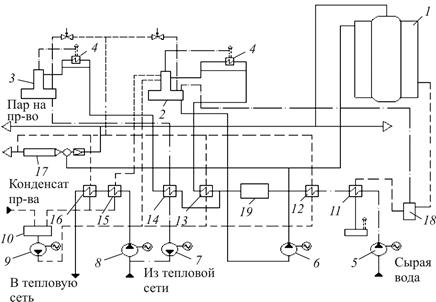 Рис. 14.2. Принципиальная тепловая схема котельной с паровыми котлами: Процессы изменения выходных координат при регулировании подачи топлива имеют длительный характер. Когда подача топлива увеличивается, часть увеличенной подачи тепла уйдет на нагрев топочной кладки, деталей топочного устройства, металла экранных труб и т.д. Следовательно, чтобы ускорить переходные процессы, регулятор подачи топлива (регулятор нагрузки) должен подать команду, учитывающую этот повышенный расход топлива (ввести форсировку). Вместе с тем, когда процесс установится в новом режиме и все части котла прогреются, эта добавочная порция тепла, если ее не снять, приведет к повышению выходной переменной выше нормы (произойдет перерегулирование). Пройдет несколько колебаний всей системы, прежде чем процесс установится. Такие колебания являются нежелательными для котельного агрегата, так как кроме неэкономичности этот режим приводит к тепловым перегрузкам и деформациям всех частей котла. Правильный выбор регуляторов и точные настройки их параметров в подсистемах обеспечивают требуемый переходный процесс и улучшают режим работы котла. Перечисленные подсистемы являются определяющими для котельной установки. Они взаимозависимы. Каждая из подсистем может быть реализована аппаратно по-разному. До 1990-х годов регулирование в котельных установках осуществлялось изменением положения задвижек, шиберов, заслонок направляющих аппаратов, регулируемых клапанов при постоянной скорости двигателей турбомеханизмов. В настоящее время задача поддержания оптимального режима горения в топке обеспечивается выбором необходимой скорости вращения электродвигателей тягодутьевых механизмов при полностью открытых шиберах дымососа и вентилятора практически во всем диапазоне рабочей производительности котельной установки. Использование частотно-регулируемых электроприводов для управления дымососами котельных установок с энергетической и с технологической точек зрения намного эффективнее. Он снижает расход топлива на 3–5 %, потребление электроэнергии – на 30–40 % при той же производительности котла, повышает точность реализации зависимости рабочих параметров при регулировании. Опыт автоматизации котельных показывает, что регулирование процесса горения позволяет достичь экономии топлива до 10 %, увеличить КПД котла на 5–6 %, сократить расход электроэнергии на дутье и тягу, уменьшить объем ремонтных работ, облегчить работу и сократить количество обслуживающего персонала. Следует иметь в виду, что при полностью открытых шиберах возможно возникновение неустойчивого режима горения при розжиге котла и в начальном диапазоне его производительности («отрыв» пламени от запальника или от горелки). Данный неустойчивый режим определяется значительными динамическими возмущениями давления (разрежение в топке котла), вызываемыми работой рядом расположенных котельных установок, связанных по газоходам с общей дымовой трубой. Второй причиной «отрыва» пламени может быть естественная тяга дымовой трубы. Дестабилизирующее влияние этих факторов может быть значительно уменьшено или вообще исключено, если на время розжига котла и при малой его производительности шиберы прикрыть. Контур управления положением шиберов введен как в систему управления вентилятором, т
