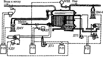 Рис. 14.3. Схема системы автоматики «Контур» Отметим две тенденции в модернизации котельных установок. 1. В январе 2007 года на Чайковской ТЭЦ введена в действие установка турбины мятого пара типа ПТ-45-15 с использованием противодавления незагруженной турбины Р-50-130. Теплофикационные турбины типов ПР, ПТР, ТР, Р, ПТ, П и Т имеют отопительные или производственные отборы пара. Загрузка отопительных отборов в весенне-осенний период неполная, летом она может полностью отсутствовать. Производственные отборы могут снижаться или их может вообще не быть при ограничении потребителей технологического пара. Отсутствие потребления пара из выхлопа турбины типа «Р» приводит к их полной остановке, а уменьшение отборов турбин типа П, Т и Р снижает мощность установленных турбогенераторов. В этих случаях установка турбин мятого пара, работающих на отборе пара с теплофикационных турбин (Р пара = 1,6 МПа, t пара = 265 °С), позволяет полностью загрузить имеющиеся турбины, обеспечивая при этом их работу на наиболее экономичном расчетном режиме. Кроме того, электрическая мощность ТЭЦ увеличивается за счет новых турбин при относительно невысоких капитальных затратах, т.к. не требуется установка новых энергетических котлов. 2. Как известно, большой процент аварий в котельных происходит из-за отказов или сбоев в системах автоматики безопасности, ошибок обслуживающего персонала. Отказы автоматики вызваны в основном тем, что используемые комплексы технических средств для автоматизации котлов и котельных, разработанные в 1970–80-х годах, в настоящее время имеют большой износ, морально устарели. Малая наработка на отказ подобных комплексов технических средств, их низкая помехоустойчивость, устаревшая элементная база, отсутствие защиты от несанкционированного доступа к управлению, регистрации нештатных ситуаций, универсальности, а также многих других сервисных возможностей, характерных для современной техники, не позволяют в полной мере обеспечить безотказную работу котлов и котельных, создать современные автоматизированные системы управления, обходиться без помощи людей при обслуживании котельных. Необходимо модернизировать системы управления котельными агрегатами на современной основе.