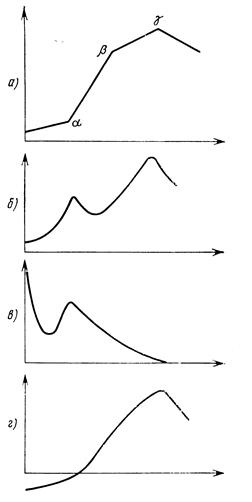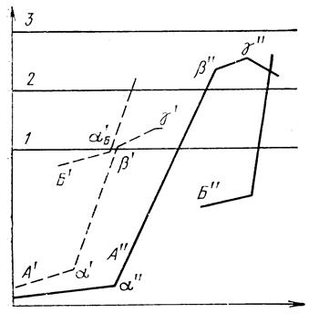 Рис.12. Рис.13. У разных технических систем эта кривая имеет, разумеется свои индивидуальные особенности. Но всегда на ней есть характерные участки, которые схематически, с подчеркнутым огрублением, выделены на рис. 13. В «детстве» (участок 1) техническая система развивается медленно. Затем наступает пора «возмужания» и «зрелости» (участок 2) - техническая система быстро совершенствуется, начинается массовое ее применение. С какого-то момента темпы развития начинают спадать (участок 3) - наступает «старость». Далее (после точки g) возможны два варианта. Техническая система А либо деградирует, сменяясь принципиально другой системой Б (современные парусники не имеют скоростей, на которых сто лет назад ходили прославленные чайные клиперы), либо на долгое время сохраняет достигнутые показатели (велосипед не претерпел существенных изменений за последние полвека и не был вытеснен мотоциклом). От чего зависит соотношение между участками? Иными словами, чем определяется положение точек перегиба (a, b, g) на «жизненной кривой» той или иной технической системы? Изучение кривых развития параметров различных технических систем (скорости движения самолетов и кораблей, скорости бурения, роста энергии ускорителей и т. д.) заставляет сразу обратить внимание на то, что реальные кривые заметно отличаются от ожидаемых теоретических кривых. Характер различия показан на рис. 14, где штриховая кривая - теоретическая, а сплошная - реальная. Казалось бы, с момента появления техническая система должна неуклонно (хотя и не очень быстро) развиваться до Период быстрого развития технической системы должен был бы завершиться в точке