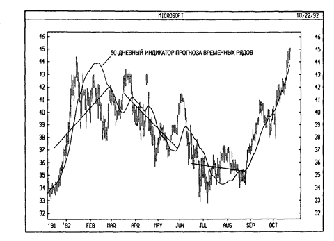 ПРОГНОЗ ВРЕМЕННЫХ РЯДОВ (Т1МЕ 5ЕК1Е5 ЮКЕСА5Т) ОПРЕДЕЛЕНИЕ Индикатор прогноза временных рядов (Т8Р) показывает статистическую тенденцию цен за определенный период времени. Эта тенденция определяется на основе анализа линейной регрессии. В отличие от прямых линий тренда линейной регрессии (см. стр. 153), график индикатора Т8Г — это кривая, составленная из последних точек множественных линий тренда линейной регрессии. Поэтому индикатор Т8Г иногда называют индикатором «скользящей линейной регрессии» или «регрессионным осциллятором». ИНТЕРПРЕТАЦИЯ Интерпретация индикатора Т8Г идентична интерпретации скользящих средних, но у него есть два преимущества перед классическими скользящими средними. В отличие от скользящих средних, индикатор Т8Г следует за ценами без большого отставания. Поскольку индикатор «подстраивается» под данные, а не усредняет их, он более чувствителен к ценовым изменениям. Назначение индикатора видно уже из его названия — он позволяет прогнозировать цены следующего периода. Такая оценка основана на ценовой тенденции бумаги за заданный период (напр., 20 дней). Если текущая тенденция сохраняется, значение индикатора прогноза временных рядов и есть прогноз цены на следующий период. ПРИМЕР На следующем рисунке показан график 50дневного индикатора Т8Г курса акций М1сго8ой. Здесь также построены три 50дневные линии тренда линейной регрессии. Как видите, конечные точки каждой линии тренда дают значения индикатора Т8Г.