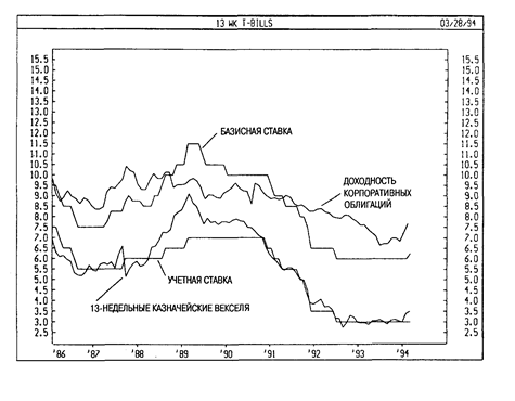 БАЗИСНАЯ СТАВКА (РК1МЕ КАТЕ] Базисная ставка — это ставка по кредитам, которые американские банки предоставляют своим лучшим корпоративным клиентам. Изменения базисной ставки почти всегда следуют за изменением учетной ставки. СТАВКИ ПО КАЗНАЧЕЙСКИМ ОБЛИГАЦИЯМ (ТНЕАЗиКУ ВОN^ КАТЕ5) Исключительно важным показателем является доходность 30летних казначейских облигаций («длинных облигаций»). Казначейство США проводит аукционы по их размещению раз в полгода. Длинные облигации отличаются наибольшей волатильностью из всех государственных облигаций в связи с большим сроком их обращения — даже незначительное изменение процентных ставок может вызвать существенное изменение цен облигаций. ставки ПО КАЗНАЧЕЙСКИМ ВЕКСЕЛЯМ (ТКЕА5ЦКУ ВЛ1 КАТЕ5) Казначейские векселя — это краткосрочные (со сроком обращения от 13 до 26 недель) инструменты денежного рынка, гарантированно обеспечивающие текущую рыночную доходность. Аукционы по их размещению проводятся Казначейством США еженедельно. ПРИМЕР На следующем рисунке показаны графики различных процентных ставок.