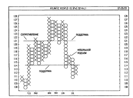 ПУНКТОЦИФРОВЫЕ ГРАФИКИ (Р01ГЧТАМО РЮиКЕ СНАКТ5) ОПРЕДЕЛЕНИЕ На пунктоцифровых графиках — в отличие от традиционных ценовых графиков — показаны только изменения цен и вообще не учитывается время. Если обычно по оси У откладывается цена, а по оси Х — время, на пунктоцифровых графиках обе оси отражают только изменения цен. Эти графики похожи на графики Кати (см. стр. 121), графики «ренко» (см. стр. 250) и графики трехлинейного прорыва (см. стр. 308). ИНТЕРПРЕТАЦИЯ Изменения цен на пунктоцифровых графиках отражают соответствующие изменения спроса и предложения на рынке. Столбец крестиков означает, что спрос превышает предложение (цены растут); а столбец ноликов — что предложение превышает спрос (цены падают). Ряд коротких столбцов означает, что спрос и предложение приблизительно равны. На пунктоцифровых графиках часто появляются такие модели, как двойные вершины и основания, бычьи и медвежьи симметричные треугольники, тройные вершины и основания и т.д. (см. стр. 168). Подробное описание всех этих моделей выходит за рамки настоящей книги. ПРИМЕР На двух следующих рисунках показаны графики курса акций Аиапас ИсЬйеИ. Первый график—пунктоцифровой, а второй—столбиковый. Как уже говорилось выше, пунктоцифровые графики отражают только движение цен. Как видно из данного пунктоцифрового графика, цены сначала колебались между уровнем поддержки 114 и уровнем сопротивления 121. После прорыва уровня сопротивления 121 (длинный столбец крестиков), он стал новым уровнем поддержки. В конце концов этот новый уровень поддержки был преодолен (длинный столбец ноликов), цены вновь успешно проверили прочность старого уровня поддержки 114, но затем, после небольшого подъема, все же опустились ниже него.