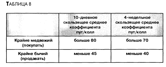 ориентиры для интерпретации коэффициента пут/колл даны в таблице 8. Но разумеется, рынок вовсе не обязан корректировать направление своего движения только потому, что в ожиданиях инвесторов преобладает чрезмерный оптимизм или пессимизм! Как любой другой инструмент технического анализа, коэффициент пут/колл следует использовать совместно с другими рыночными индикаторами.