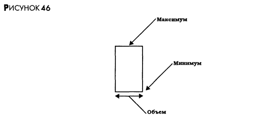 РАВНООБЪЕМНЫЕ ГРАФИКИ (ЕСНЛУОШМЕ СНАКТ5) ОПРЕДЕЛЕНИЕ Равнообъемные графики строятся особым образом, отражающим взаимосвязь между ценами и объемом торгов. Этот метод графического анализа разработал Ричард Армсмл., подробно описав его в книге «Цикличность объема на фондовом рынке» (Уо1ите Сус1е8 т 1Ье 8<юск: Маг^е!). На равнообъемных графиках объем представлен не как второстепенный показатель под графиком цены, а одновременно с ней при помощи двухмерных прямоугольников. Верхняя сторона прямоугольника обозначает максимум цен за данный период, а нижняя — минимум. Ширина прямоугольника — в этом как раз уникальная особенность равнообъемных графиков — соответствует объему торгов за данный период. На рис. 46 представлены элементы равнообъемного прямоугольника.