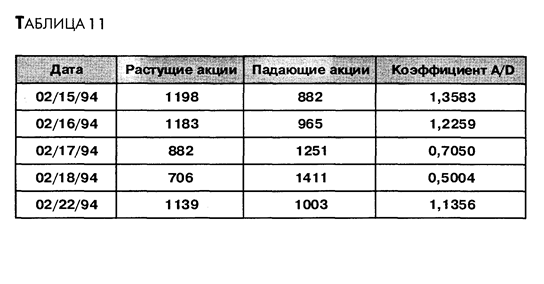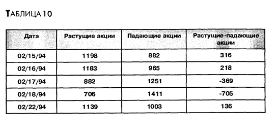 50, а стрелки «продажа» там, где оно опускалось ниже 125. Обычно в качестве границ перекупленное™ и перепроданности я использую уровни ±100, но в данном случае сильная восходящая тенденция в течение всего периода привела к смещению графика индикатора вверх. РАСЧЕТ Расчет индикатора прост: надо найти разность между числом подорожавших и подешевевших за день акций: Растущие акции. — падающие акции. Примеры расчета приведены в таблице 10.