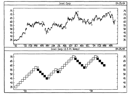 «РЕНКО» ГРАФИКИ (КЕМКОСНАКТ5) ОПРЕДЕЛЕНИЕ Считается, что графики «ренко» получили название от японского слова «геп§а»,.то есть «кирпич». «Ренко» очень схожи с графиками трехлинейного прорыва (см. стр. 308), с тем лишь различием, что составленная из кирпичей линия на графике «ренко» продолжает строиться в направлении предыдущего ценового движения, только если цены изменяются на определенную минимальную величину (цену клетки). Все кирпичи имеют одинаковый размер. Так на графике «ренко» с ценой клетки 5 пунктов увеличение цены на 20 пунктов изображают в виде четырех кирпичей высотой 5 пунктов. В США графики «ренко» стали известны благодаря Стивену Нисону после публикации его книги «За гранью свечей» (Веуопй СапсИезйск.з, 81:еуеп №зоп). ИНТЕРПРЕТАЦИЯ Основным сигналом разворота тенденции служит появление нового белого или черного кирпича. Новый белый кирпич означает начало новой восходящей тенденции, а новый черный — новой нисходящей тенденции. Как и другие системы следования за тенденцией, графики «ренко» иногда выдают ложные сигналы, если тенденция оказывается непродолжительной. При этом они сохраняют основное достоинство таких систем — позволяют охватить основную часть любой значительной тенденции. Поскольку графики «ренко» выделяют господствующую тенденцию, отсеивая незначительные ценовые изменения, они также полезны для определения уровней поддержки и сопротивления. ПРИМЕР На следующем рисунке показаны классический столбиковый график курса акций 1п1е1 и график «ренко» с ценой клетки 2,5 пункта. Стрелка