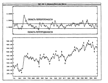 мера, цены обычно падали после вхождения в область перекупленности — выше 1,25 (стрелки «продажа») — и возрастали после попадания в область перепроданное™ — ниже 0,90 (стрелки «покупка»).