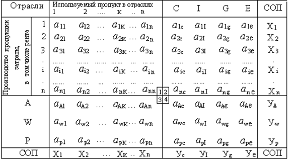 где: n – количество отраслей, i – i –ая отрасль, поставляющая промежуточный продукт; к – к-ая отрасль, потребляющая промежуточный продукт; СОП – совокупный общественный продукт; А – амортизация; W – заработная плата; P – прибыль; C – потребительские расходы; I – инвестиционные расходы; G – государственные расходы; E – чистый экспорт. 1-ый квадрант а11 – продукция, произведенная в первой отрасли и потребляемая в первой отрасли; а21 – продукция, произведенная во второй отрасли и потребляемая в первой. 2-ой квадрант а1с – продукция первой отрасли, которая идет на потребление; а1I – продукция первой отрасли, которая идет на инвестиции; а1g – продукция первой отрасли, которая идет на государственные расходы; а1Xn – продукция первой отрасли, которая идет на экспорт. 3-ий квадрант аa1 – амортизационные отчисления в 1-ой отрасли; аw1 – заработная плата, выплачиваемая в 1-ой отрасли; ap1 – прибыль, получаемая 1-ой отраслью. 4-ый квадрант аac – амортизационные отчисления, идущие на личное потребление (обычно равны 0); аaI – амортизационные отчисления, идущие на инвестиционные расходы; аag – амортизационные отчисления, идущие на государственные расходы (обычно равны 0); аwc – заработная плата, которая идет на личное потребление; a wI – заработная плата, идущая на сбережения; awg – заработная плата в государственном секторе; apc – прибыль, идущая на потребительские расходы (премии); apI – прибыль, идущая на инвестиционные расходы; Исходя из таблицы 1, условие равновесия в экономике можно записать в следующем виде (32):