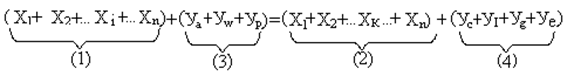 Скобка (1) отражает затраты на производство промежуточного продукта. Скобка (2) показывает промежуточный продукт, который используется всеми отраслями. Скобка (3) отражает добавленную стоимость всех отраслей. Скобка (4) показывает конечный продукт всех отраслей. Скобка (1) и скобка (2) равны друг другу, тогда условием равновесия будет: