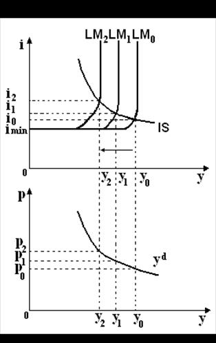 Гибкость цен в стране воздействует на рынок благ в стране не прямо, а косвенно через денежный рынок. При повышении уровня цен в стране количество денег необходимых для обращения возрастает, при снижении уровня цен – уменьшается. При этом линия LM сдвигается либо влево, либо вправо. Ценовой импульс с рынка денег на рынок благ Ценовой импульс передаётся с денежного рынка на рынок благ, воздействуя при этом на совокупный спрос. Возникает следующая цепочка: повышение уровня цен в стране приводит к сокращению реальных кассовых остатков => увеличивается предложение ценных бумаг, процентная ставка растет => снижается курс ценных бумаг => из-за высокой процентной ставки снижаются инвестиционный спрос => из-за эффекта мультипликации снижается доход и уменьшаются совокупные расходы. Рис. 43. иллюстрирует влияние изменения цен на рынок благ посредством денежного рынка. На верхнем графике при повышении уровня цен кривая LM0 сдвигается в LM1 и далее в LM2. В результате увеличения спроса на деньги повышается процентная ставка с i0 до i1 и далее до i2. Увеличение процентной ставки сокращает инвестиционные расходы, что сопровождается движением по кривой IS влево вверх. Уменьшение инвестиций приводит к сокращению дохода с y0 до y1, и далее до y2. Перпендикуляры, опущенные из точек совместного равновесия на рынке благ и денег, на нижний график покажут величину совокупных расходов при различных уровнях цен.