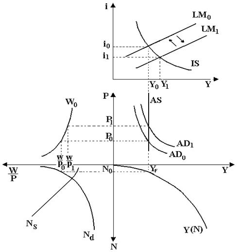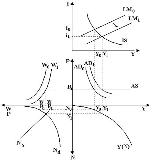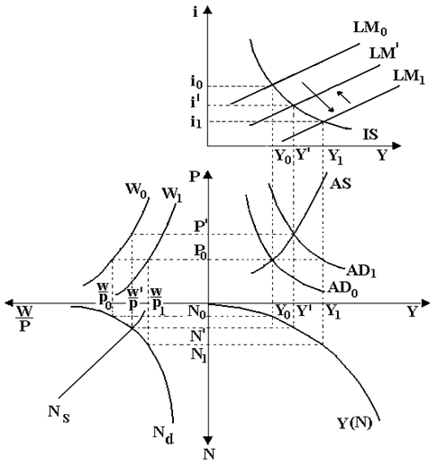 Если цены растут незначительными темпами, то объем производства возрастает не величину, меньшую, чем запланированная. Денежная экспансия сдвигает кривую LM0 в LM1. В результате процентная ставка должна снизиться с i0 до i1, а эффективный спрос возрасти с у0 до у1, однако, увеличение совокупного спроса с AD0 до AD1 приводит к несоответствию возросшего совокупного спроса AD1 имеющемуся совокупному предложению AS0. Возникший дефицит приводит к возрастанию цен с P0 до P', что приводит к сдвигу кривой LM1 в LM'. В результате повышается процентная ставка с i1 до i', что приводит к уменьшению частных инвестиций и, соответственно, к увеличению дохода с У0 не до У1, а до У'. Это, в свою очередь, приводит к увеличению занятости с N0 не до N1, а до N'. (рис. 71).