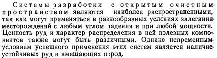 К этому классу относятся системы разработки, при которых очистное пространство в процессе выемки остается открытым и поддержание его осуществляется рудными (иногда породными) целиками или простой крепью для поддержания отдельных участков кровли или для сооружения настила для работающих. Обязательным условием применения систем с открытым очистным пространством является устойчивость руды и окружающих пород. Применение их возможно в рудных телах с разнообразной формой, размерами, углом падения ценностью руд. Практика горных работ показывает, что разработку с открытым выработанным пространством можно вести до глубины порядка 800 м. В зависимости от способа ведения очистной выемки выделяют группы: Потолкоуступные системы разработки с подвиганием уступного фронта очистной выемки снизу вверх - от нижнего основного штрека к верхнему вентиляционному. Сплошные системы разработки с подвиганием фронта очистных работ по всей длине или ширине блока с нерегулярным оставлением постоянных рудных целиков. При небольшой мощности применяют крепление. Линия очистных забоев бывает прямой или уступной. Камерно-столбовые системы разработки отличаются систематическим чередованием параллельных выемочных камер и разделяющих их междукамерных целиков с подвиганием фронта очистной выемки в каждой камере вдоль ее длинной оси. Системы разработки с подэтажной отбойкой. Отличительная особенность системы заключается в разделении блока по высоте на подэтажи и отбойке руды из подэтажных выработок. Фронт очистной выемки подвигается по всей высоте блока в виде вертикальной или уступной линии. Этажно-камерные системы разработки характеризуются отбойкой руды глубокими скважинами на всю высоту камеры вертикальными слоями или на всю длину камеры горизонтальными слоями. Условия применения потолкоуступных систем разработки