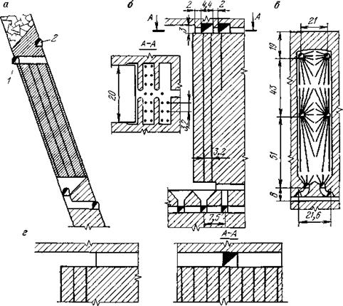 Рис. 21 Этажно-камерная система разработки с отбойкой руды вертикальными слоями. Отбитая руда выпускается с помощью вибропитателей. Выпуск руды и бурение - независимы, и частично руда может магазинироваться в нижней части камеры. Производительность камеры изменяется от 30 до 100 тыс. т. в месяц. На некоторых рудниках для отбойки применяют параллельные скважины-вертикальные или наклонные в зависимости от угла наклона стенок камеры. Наклонные параллельные скважины (рис. 22, а) располагают в один ряд и бурят из штрека 1 и буровых ортов 2, расстояние между ними по простиранию (толщина слоя) 5 м. При толщине отбиваемого слоя меньше 4,5—5 м целик между буровыми выработками имеет недостаточную толщину и разрушается во время проведения буровой выработки или массового взрыва. При толщине отбиваемого слоя не более 4 м скважины располагают по схеме, показанной на рис. 22, б. Буровые выработки проводят широкими и в них располагают по два ряда параллельных скважин. Для улучшения дробления руды и снижения сейсмического эффекта взрывание производят электродетонаторами короткозамедленного действия. Иногда параллельные скважины бурят с нижней и верхней (рис. 22, г) подсечки. Отбойка слоя веерными комплектами скважин (рис 22, в), пробуренных из четырех буровых выработок, применяется в рудах и вмещающих породах с большим коэффициентом крепости. При высоте этажа 121 м высота камеры составляет 94 м, ширина 21 м. Восходящие скважины глубиной до 19 м бурят перфораторами, нисходящие диаметром 60 мм и глубиной до 43 м — алмазными коронками. Толщина отбиваемого слоя и расстояние между концами скважин 3 м. Выход руды с 1 м скважины 19,5 т.