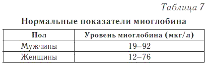 Миоглобин содержится в скелетной и сердечной мышцах. Он доставляет кислород в скелетные мышцы. Поскольку миоглобин выводится из организма с мочой, его количество зависит от работы почек. При нарушении их функции наблюдается рост уровня миоглобина в крови (табл. 7).