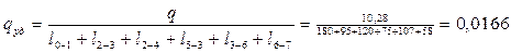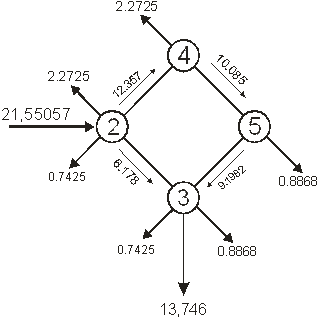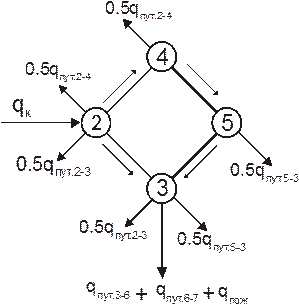 qк поступающей в кольцо разделим в точке 2, как 2/1, причём больший расход направим по участку 2-4-5-3. Из расхода, поступающего в узел 2 извлекается половина путевого расхода qпут. 2–4 и половину путевого расходаqпут.2–3.Остаток, равный qк–0,5 qпут. 2–3–0,5 qпут. 2–7 делится на 3 и 1/3 направляется к узлу 3,а 2/3 – к узлу4. Далее распределение воды в узле 3: из расхода (qк–0,5 qпут. 2–3–0,5 qпут. 2–4)/3 извлекается половина qпут. 2–3. Узел 4: из расхода 2*(qк–0,5 qпут. 2–3–0,5 qпут. 2–4)/3 извлекается половина qпут. 2–4. Узел 5: из расхода (2*(qк–0,5 qпут. 2–3– qпут. 2–4)/3)- 0,5qпут. 2–3 извлекается половина qпут. 5–3). Далее расход поступает в узел 3.