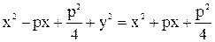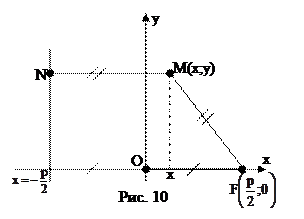 Для вывода уравнения параболы выберем систему координат Оху так, чтобы ось Ох проходила через фокус F перпендикулярно директрисе в направлении от директрисы к F, а начало координат О расположим посередине между фокусом и директрисой (рис. 10). В выбранной системе фокус F имеет координаты , а уравнение директрисы имеет вид или .
