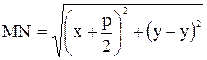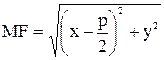 Пусть - произвольная точка параболы. Соединим точку М с F. Проведем отрезок МN перпендикулярно директрисе. Согласно определению параболы MF = MN. По формуле расстояния между двумя точками находим: