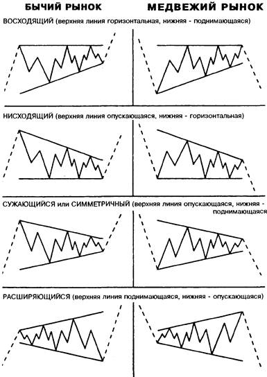 Треугольники обычно появляются на четвертой волне, предшествуя последнему движению в направлении основной тенденции (они также могут появиться на волне b, входящей в корректирующую конфигурацию а-Ь-с). Таким образом, при восходящей тенденции треугольники можно охарактеризовать как бычью и медвежью модель одновременно. Мы называем ее бычьей потому, что треугольники показывают возобновление тенденции роста. А медвежьи они потому, что сигнализируют также о приближении цен к вершине, что, как правило, происходит после еще одной волны роста. Принципы интерпретации треугольников по Эллиоту почти не отличаются от классического анализа этих моделей. Однако теория волн позволяет делать это более точно. Мы уже говорили в главе б, что треугольник обычно является моделью продолжения тенденции - именно так его описывает и Эллиот. В теории волн треугольник - конфигурация, свойственная консолидации в период застоя. Он подразделяется на пять волн, причем каждая из них в свою очередь складывается из трех волн. Эллиот также выделяет четыре различных типа треугольников - восходящий, нисходящий, симметричный и расширяющийся, каждый из которых мы описали в главе 6. На рис. 13.28 вы видите примеры всех четырех разновидностей модели для тенденций роста и падения. На фьючерсных товарных рынках графические модели иногда формируются не полностью - в отличие от рынка ценных бумаг, поэтому треугольники могут иметь здесь только три волны вместо пяти (тем не менее нужно помнить, что минимальным требованием для формирования треугольника продолжают оставаться четыре точки, две верхних и две нижних, которые позволяют провести две сходящиеся линии тренда). Согласно теории волн Эллиота, пятая, последняя волна, входящая в состав модели треугольник, иногда "прорывает" линию тренда, подавая тем самым ложный сигнал, но затем возобновляется движение в первоначальном направлении. По Эллиоту, критерии измерения для пятой и последней волны после завершения треугольника в целом схожи с традиционными: после прорыва рынок должен пройти расстояние, равное самой широкой части треугольника (его высоте). Здесь есть еще один любопытный момент, касающийся оценки времени достижения рынком окончательной вершины или основания. По Прехтеру, вершина треугольника (то есть точка, в которой сходятся линии тренда) часто соответствует моменту завершения пятой, последней волны.