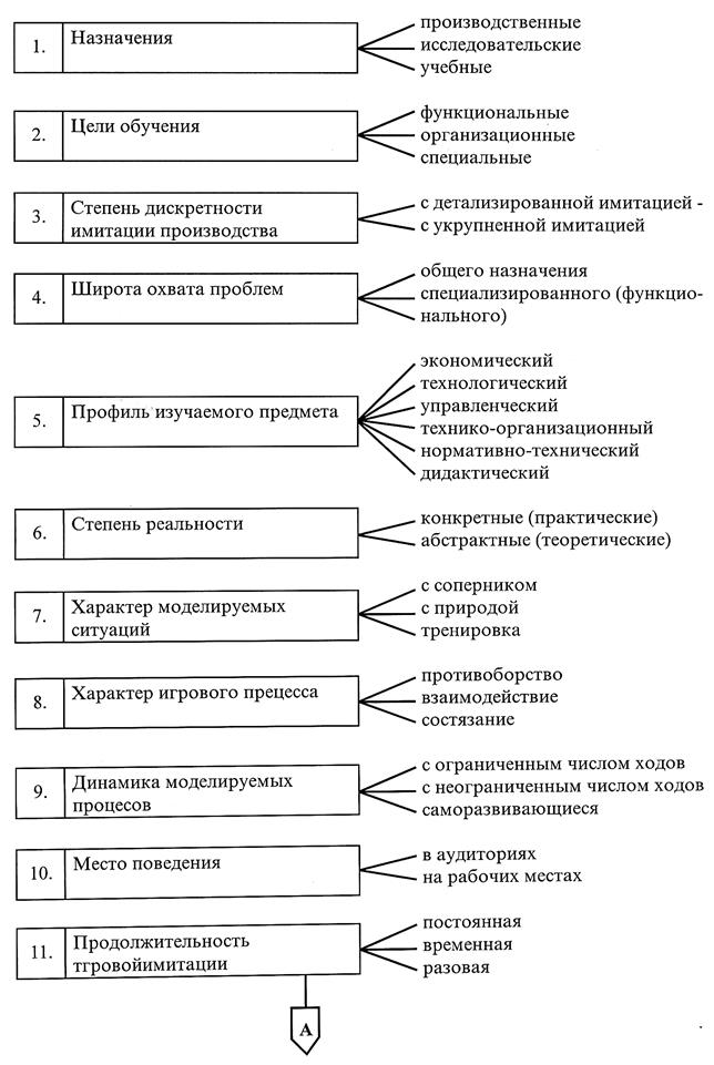результатов деятельности через 1-3 года. Кроме того, в играх первого типа может быть применен реальный масштаб времени, в то время как в играх второго типа - всегда условный. 4. По широте охвата проблему а) общего назначения; б) специализированного (функционального). В играх общего назначения все элементы игровой имитации сведены до такой методической последовательности, которая обеспечивает (иногда в упрощенном варианте) решения любой проблемы (нередко в общем, но приемлемом для практики виде). Специализированные игры рассматривают частную проблему с конкретизацией и точным описанием специфических ее особенностей. 5. По профилю изучаемого предмета: а) экономические} б) технологические; в) управленческие; г) технико-организационные; д) нормативно-технические; е) дидактические. 6. По степени реальности игровых моделей: а) конкретные (практические); б) абстрактные (теоретические). Конкретные игры.решают точно обозначенные проблемы или проблемы, близкие к конкретной ситуации (с частичным учетом ограничений, примитивной схемой системы). Абстрактные игры предназначены для проверки степени достоверности гипотетической модели о закономерности функционирования систем, приобретения навыков использования методов научного познания мира и т.д. 7. По характеру моделируемых ситуаций а) игра с соперником (борьба сторон). Моделируются процессы управления в условиях взаимовлияющего поведения или воздействия друг на друга различных систем. б) игра с природой. Моделируется процесс управления в условиях вероятностного поведения окружающей среды или управляемого объекта. в) игра-тренировка. Моделируется процесс управления системой в динамике самопроизвольного развития ситуации. Отрабатываются навыки в принятии оперативных решений, а также механизмы взаимодействия отдельных звеньев системы. 8. По характеру игрового процесса. а) отношения между играющими группами слушателей носят характер противоборства. Действие одной прямо или косвенно влияет на действие другой группы. При этом контакт между группами не обязателен. б) разыгрывается взаимодействие между группами. Контакт с помощью различных видов (средств) связи является обязательным элементом игры. в) состязание. Группы слушателей между собой не связаны, играют независимо друг от друга и, начиная с одной и той же исходной ситуации, достигают различных успехов. 9. По динамике моделируемых процессов. а) игры с ограниченным числом ходов. б) игры с неограниченным числом ходов. в) саморазвивающиеся игры без масштаба времени и с масштабом времени. К примеру, в одно занятие, учебный час проигрывается квартал деятельности предприятия, в четыре таких занятия - год) 10. По месту проведения деловые игры делятся на игры в аудиториях и на рабочих местах. 11. По продолжительности игровой имитации. а) постоянные; б) временные; в) разовые. Игры постоянного применения - это многоцикличные игры по анализу и решению проблем, имеющих тенденцию к непрерывному изменению своих характеристик во времени (например, развитие производственной базы, изменение номенклатуры производственной продукции). Временные игры - это игры, решающие ситуацию эпизодического характера (например, упорядочение организационной и функциональной структуры организации, решение различных проблем в период обучения на ФПК). Разовые игры ре