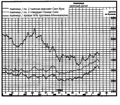 Рисунок 2.8. ГРАФИК ЦЕН НАЛИЧНОГО ТОВАРА: ПШЕНИЦА Источник:. Перепечатано с разрешения © 1995 Knight-Ridder Financial, 30 South Wacker Drive, Suite 1810, Chicago, Illinois 60606. Рисунок 2.9. ГРАФИК СПРЭДОВ: ХЛОПОК, ОКТЯБРЬ/ДЕКАБРЬ