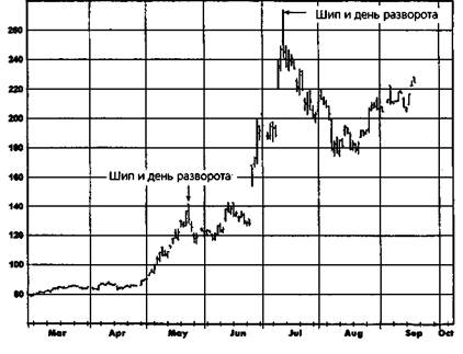 а также может быть ниже максимума последующего дня, поскольку в определении дня разворота цены последующего дня вообще не учитываются. Кроме того, возможно, что цена закрытия дня разворота не будет находиться вблизи дневного минимума, как требует определение шипа, даже если она ниже цены закрытия предыдущего дня. Иногда день разворота и день шипа совпадают. Такие дни гораздо важнее, нежели простые дни разворота. Альтернативой более жесткому определению дня разворота является использование стандартного определения, но с условием, чтобы этот день был одновременно и шипом. (Дни, удовлетворяющие жесткому определению дня разворота и определению шипа, случаются довольно редко.) На рис. 6.9 представлен пример мощного «бычьего» рынка. Обратите внимание на два дня, соответствующие определениям дня шипа и дня верхнего разворота. Первый из этих дней был относительным максимумом, который дал весьма преждевременный сигнал. Однако второй день отметил точный пик неистового подъема цен. 114 ЧАСТЬ 1. анализ графиков