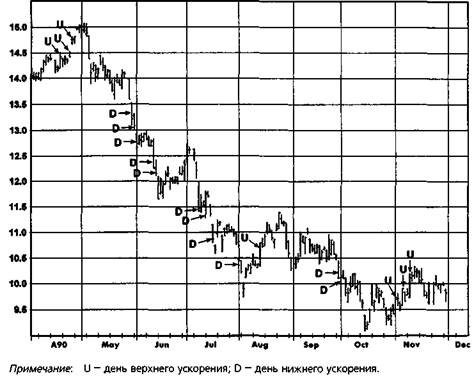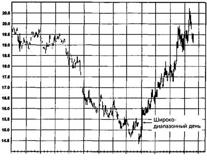 Примечание: U - день верхнего ускорения; D - день нижнего ускорения. Широкодиапазонный день. Лень, когда коэффициент волатильно-сти (volatility ratio — VR) больше k (например, k = 2,0). VR равняется истинному диапазону текущего дня, деленному на истинный диапазон предшествующего N-дневного периода (например, N = 15). Широкодиапазонные дни могут иметь особое значение. Например, широкодиапазонный день с высоким закрытием, который случается после продолжительного снижения цен, часто является сигналом разворота тенденции вверх. Рис. 6.14-6.16 показывают примеры широкодиапазонных дней, которые произошли после длительного снижения и дали сигналы к началу сильного роста цен. На рис. 6.16 фактически имеются два соседних широкодиапазонных дня, которые образовались как раз над минимумом предшествующего «медвежьего» рынка. Аналогичным образом широкодиапазонный день с низким закрытием, который появляется после продолжительного подъема цен часто 118 ЧАСТЬ 1. анализ графиков Рисунок 6.13. ДНИ УСКОРЕНИЯ НА «МЕДВЕЖЬЕМ» РЫНКЕ: САХАР, МАРТ 1991