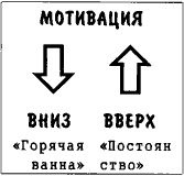 Обозначь стрелками! МОТИВАЦИЮ ВНИЗ назовем "горячей ванной", а МОТИВАЦИЮ ВВЕРХ - "постоянной". Объясню. Наверное, ты уже бывал на встречах усиления мотивации, после которых почувствовал: после этого всегда сможешь с подъемом строить дело. Было достаточно нескольких недель или месяцев, чтобы ты опять остыл. Когда принимаешь горячую ванну, кажется, что чем горячее ванна, тем быстрее остываешь.