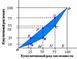 Графически изобразить и измерить неравенство доходов можно с помощью кривой Лоренца. Для ее построения отложим по оси абсцисс последовательно просуммированные удельные веса индивидуумов в их общем числе, учитывая, что удельный вес каждого из них составляет ¼, или 25%, а по оси ординат – кумулятивные доли доходов этих людей. Соединив все точки, получим кривую Лоренца. Неравенство доходов характеризуется степенью отклонения кривой Лоренца от биссектрисы 1-го координатного угла. Это отклонение можно измерить через отношение площади фигуры S между кривой Лоренца и прямой OD к площади всего треугольника OKD. В результате получим показатель, который называется коэффициентом концентрации (или коэффициентом Джинни) G. С помощью кривой Лоренца можно судить о степени неравенства при распределении дохода в той или иной стране. Абсолютное равенство в распределении дохода соответствует прямой OD, то чем дальше кривая Лоренца отстоит от этой прямой, тем сильнее неравенство. Это равносильно утверждению, что неравенство в распределении дохода тем выше, чем больше площадь фигуры, ограниченной прямой OD и кривой Лоренца (заштрихованная область).