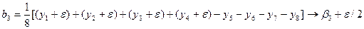 Чтобы исключить влияние систематических ошибок, вызванных внешними условиями (переменой температуры, сырья, лаборанта и т. д.), рекомендуется случайная последовательность при постановке опытов, запланированных матрицей. Опыты необходимо рандомизировать во времени. Термин «рандомизация» происходит от английского слова random — случайный. Почему рандомизация опытов важна, покажем на следующем примере. Пример 4. В таблице 2.7 приведена матрица опытах x3 имеет верхнее значение, а в последних четырех опытах — нижнее значение. Допустим, что экспериментатор может поставить в первый день четыре опыта и во второй день также четыре опыта. Можно ли опыты ставить подряд и в первый день реализовать опыты № 1, 2, 3 и 4, а во второй — 5, 6, 7 и 8? Ставя опыты подряд, матрица разбивается на две части или на два блока: в первый блок входят опыты № 1» 2, 3 и 4, во второй — № 5, 6, 7 и 8. Если внешние условия первого дня каким-то образом отличались от внешних условий второго дня, то это способствовало возникновению некоторой систематической ошибки. Обозначим эту ошибку Тогда четыре значения параметра оптимизации сдвинуты на величину