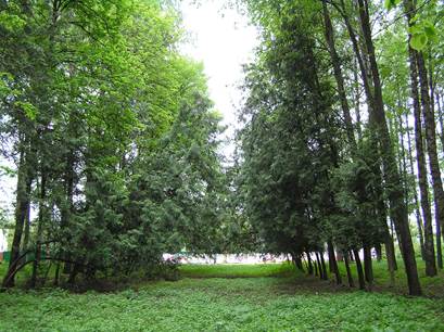 Особого внимания заслуживают аллейные посадки вдоль лучевых просек, которые придают парку индивидуальность и особый колорит. Они сформированы деревьями разных пород – берёзы (фото 10), липы и берёзы (фото 11), липы и клёна остролистного. С внутренней стороны нескольких лучевых просек были высажены по одному ряду туи западной (фото 12). Однако при посадках не было учтено, что туя является светолюбивой породой, требует прямого солнечного освещения и плохо развивается при затенении лиственными деревьями. По этой причине высаженные в парке туи в большинстве случаев находятся в ослабленном состоянии и мало декоративны. Следует знать, что длительное время произрастающие в затенении и уже сильно ослабленные туи даже при их осветлении уже не способны к нормальному росту и развитию. И вырубка здоровых деревьев местных пород ради этих отставших в росте и чахлых туй не может быть оправдана.