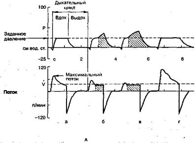Рис. 10.2. Режим поддержки дыхания давлением с обеспечением заданного объема. Кривые давления (Р) и потока (V) в дыхательных путях. А — теоретические: а — обычный режим, дыхательный объем не ниже заданного; б — автоматическое повышение давления в связи с недостаточным объемом; в — удлинение вдоха в связи с недостаточным объемом; г — обычный режим, но с удлиненным вдохом. Б — реальные. вдоха и заданное давление достигается позже, поэтому кривая давления приближается к треугольной форме. Имеется сообщение об успешном проведении в течение 2— 3 сут пропорциональной вспомогательной вентиляции через носовые или лицевые маски у больных отеком лёгких, сепсисом, астматическим статусом и пневмонией, причем отмечено, что пациенты намного легче адаптировались к этому режиму, чем к обычной поддержке давлением; только 3 из 11 больных по- требовалась интубация трахеи и ИВЛ [Burchardi H., Sydow M., 1994; Patrick W. et al., 1996]. Своеобразной модификацией метода поддержки вентиляции давлением является режим с обеспечением заданного дыхательного объема (Volume assured pressure support — VAPS), являющийся комбинацией поддержки давлением с ППВЛ, но не путем периодического включения принудительного вдоха (см. главу 11), а автоматическим повышением давления в конце фазы вдоха, если заданное давление не обеспечивает заранее установленный минимум дыхательного объема. Этот режим реализован в респираторе «Bird 8400ST». Сущность режима состоит в том, что если Рпик достигло установленного уровня, но дыхательный объем меньше заданного, инспира-торный поток не прекращается и давление в дыхательных путях повышается (рис. 10.2). Может также удлиниться фаза вдоха. Особенность данного режима также в том, что он реализуется в условиях постоянного, а не снижающегося потока. H.Tokioka и соавт. (1993) сравнили ВВЛ методом поддержки давлением и методом «откликания» на попытку вдоха заданным объемом. При первом способе дыхательный объем был больше, а среднее давление в дыхательных путях ниже. Кроме того, при поддержке давлением быстрее удавалось добиться снижения частоты самостоятельного дыхания. Некоторые авторы считают, что при «откликании» респиратора на снижение давления отрицательную роль может играть внутреннее ПДКВ, создающееся в результате высокого аэродинамического сопротивления выдоху и большой частоты дыхания [Конюков Ю.А., Картавенко В.И., 1995, и др.]. При этом триггер может срабатывать с существенным запозданием. Полностью соглашаясь, что лучший способ запуска триггера — откликание на поток («flow by»), все же заметим, что неустраненные грубые нарушения механических свойств лёгких, на наш взгляд, служат противопоказанием к переходу от ИВЛ к ВВЛ, а выраженное тахипноэ, при котором появляется внутреннее ПДКВ, может быть устранено правильным подбором задаваемого РПИк- Поддержка дыхания давлением, позволяющая дозированно увеличивать долю работы дыхания больного, значительно облегчает переход от ИВЛ к спонтанному дыханию, постепенно «перекладывая» нагрузку с респиратора на дыхательный аппарат пациента. Как показал наш опыт, этот метод особенно эффективен у больных, которым ИВЛ начали в связи с паренхиматозной острой дыхательной недостаточностью [Лес-кин Г.С., Кассиль В.Л., 1995]. В то же время В.В.Лихванцев и В.И.Смирнова (1993) указывают, что после длительной ИВЛ (более 1 нед) изолированное использование метод