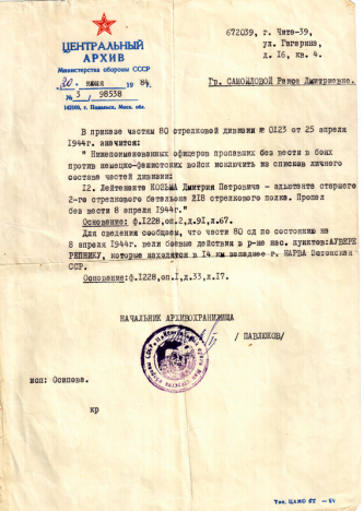 В апреле 1944 года 80 дивизия ушла в район Таллинн» Таллиннский военкомат мое письмо переслал в Кохтла-Ярве. Райисполком». По уходу за братской могилой проявляют Кохтла-Ярверский Горвоенкомат и Жители п. Синимяэ и учащиеся средней школы города Силламяэ. Постоянную заботу Эстонской ССР. На могиле установлен памятник. За могилой ухаживают местные Гражданского кладбища поселка Синимяэ (Синие горы), Кохтла-Ярверского района Захороненных в Братскую могилу №2. Братская могила №2 расположена на территории Что имя Вашего отца – Козьмы Дмитрия Петровича – занесено в списки погибших и Газета «Смена» Ленинградского Обкома ВЛКСМ. газета обратилась в Нарвский горвоенкомат. Пришел ответ: «Уважаемая Раиса Дмитриевна, сообщаю Вам, «Пишу в город Подольск Московской области в Министерство Обороны. Пришел ответ. На основании этого документа еду в июне 1986 года в город Нарву, где якобы отец погиб. В городском военкомате ответили: Александра Александровна и брат Валерий едут в селение Синимяэ, где в 1944 году шли самые жестокие, кровопролитные бои – воинские захоронения – братские могилы»