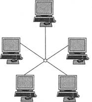 В зависимости от характера коммутации массивов обрабатываемой информации компьютерные сети традиционно делятся на сети с топологией (структурой) следующих видов: звезда — предполагает соединение компьютеров в одной точке (рис. 1);