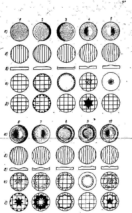 Рис, 28. Зональные ошибки зеркала и, способы их устранения. а) Теневая картина Фуко, б) теневая картина Ронки (см 29), в) теневой рельеф, г) подрезка полировальника и местная ретушь, д) специальная формовка полировальника. 1 - идеальная сфера с "плоским" теневым рельефом, а - завал края, а - подвернутый край, 4 - яма в центре, 5 - бугор в центре, 6 - яма в центре и завал края, 7 - подвернутый край и бугор и центре, 8 - канавка, 9 - валик, 10 - яма в центре и канавка.