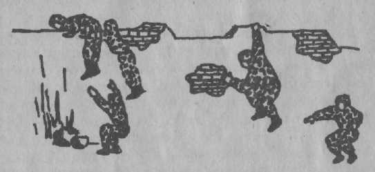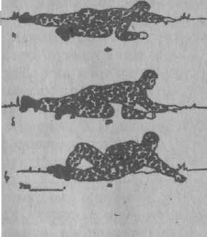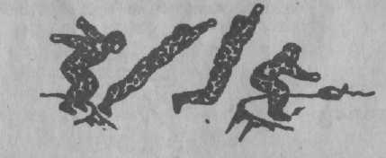 Рис. 1 Способы передвижения и преодоления препятствий Обычными способами передвижения являются ходьба и бег. Эти способы мы с вами хорошо знаем и пользуемся ими с младенчества. И в данном случае нас они интересуют лишь как наиболее простые и доступные средства для воспитания общей выносливости. Существуют также способы и особенности передвижения, которые зависят от характера местности, погодных условий, особенности деятельности человека. Например, разведчикам необходимо умение передвигаться скрыто и тихо. И этому необходимо учиться. При длительных переходах следует двигаться в привычной для каждого манере, сохраняя глубину и ритмичность дыхания. Мышцы ног и туловища должны быть по возможности расслаблены. Для сохранения ритмичности работы организма на легких спусках шаг удлиняется, на трудных участках и подъемах укорачивается. Изменить ритм нужно плавно, постепенно набирая скорость в начале движения и сбавляя ее за 3-5 минут до конца. При остановках, в ходе длительного перехода, если позволяет обстановка, рекомендуется 1-2 минуты потоптаться в установленном темпе, чтобы постепенно снять нагрузку. В тех случаях, когда необходимо двигаться скрытно используются способы передвижения: ходьба пригнувшись, ходьба бесшумно /крадучись/, перебежки, переползание. Ходьба пригнувшись применяется на местности с невысокими укрытиями /посевы, заборы, канавы, кустарники, и т.п./. При этом способе ходьбы корпус наклоняется вперед, а ноги сгибаются в коленях так, чтобы имеющееся укрытие полностью скрывало идущего. Шаг делается шире обычного. Нога при выносе вперед ставится на пятку, затем на всю ступню и носок. Ходьба бесшумно /крадучись/ применяется разведчиками при движении в непосредственной близости с противником, а также охотниками для сближения с добычей. Шаг при такой ходьбе короче обычного. Нога ставится легко, осторожно, чтобы можно было сразу же поднять ее, если она попадет на предмет, производящий шум. При движении на короткое расстояние ногу лучше всего ставить на носок. При движении на значительное расстояние нога выносится и ставится осторожно на пятку, тяжесть тела постепенно переносятся на нее с другой, слегка согнутой ноги. По вязкому грунту /мелкой грязи/ удобнее передвигаться неторопливыми шагами. Ноги расставить немного шире, чем при обычной ходьбе, осторожно ступая всей ступней. При движении по камням, щебню, через развалины строений прежде чем наступить нужно нащупать ногой твердую точку опоры и постепенно переносить на нее тяжесть тела. Шаг следующей ногой делать только после принятия устойчивого положения на первой. При движении по высокой траве рекомендуется выше поднимать ноги и ставить их на землю с носка. При движении по мелкой воде, чтобы не создавать шума, ногу опускать постепенно с носка, протаскивая ее вперед по воде скользящим движением, как при ходьбе на лыжах. При низкой температуре зимой скрип шагов по снегу далеко слышен. В годы войны, чтобы уменьшить этот шум, разведчики обшивали подошвы сапог шубными лоскутками, обматывали мягкими тряпками. Для звуковой маскировки своего движения нужно использовать посторонние естественные шумы /скрип деревьев, шум ветра и т.п./. Необходимо помнить, что более неслышно можно подойти когда ветер дует со стороны места к которому движешься. Перебежки обычно совершаю