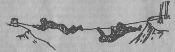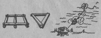 Рис. 7 ко мотков и прочно закрепил конец. Подтягиваясь по веревке, необходимо подползти к дереву. На вашем пути могут встретиться водные преграды. В зависимости от глубины, скорости течения, характера дна их можно преодолевать либо вброд, либо вплавь. Хорошо если вы прекрасно плаваете, тогда переправа для вас не составит большого труда. Однако если вы не вполне уверены в себе, или у вас большой груз, или достаточно широкая водная преграда, необходимо подготовить подручные средства. Рис 6. Перед переправой нужно раздеться, снять обувь и все это герметично упаковать, чтобы после преодоления водной преграды одеться в сухую одежду. Рис 7. Для переправы дополнительных грузов можно соорудить плотик. Рис 8. При преодолении реки с быстрым течением желательно предварительно натя-