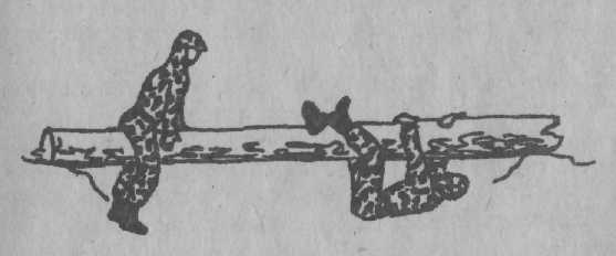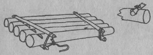 Рис. 9 нуть через речку прочную веревку /забросом или товарищем умеющим плавать/. Рис 8. По реке можно и передвигаться, если ее течение совпадает с направлением вашего движения. Для этого необходимо сделать плот при наличии строительного материала. Плот изготавливают из сухостойных деревьев /кедр, ель, лиственница и др./ диаметром 20 - 30 см. Рис 9. Помимо перечисленных выше способов передвижения и преодоления препятствий следует отметить еще некоторые, которые при достаточной тренировке помогут вам в будущей службе или в повседневной жизни. Эти способы будут показа-